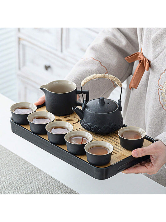 14-Piece Chinese Gongfu Tea Set - Black Ceramic Teapot With 6 Cups & Bamboo Tray, Traditional Kiln-Glazed Porcelain - Portable Tea Ceremony Set For Adults, Perfect Gift For Tea Lovers