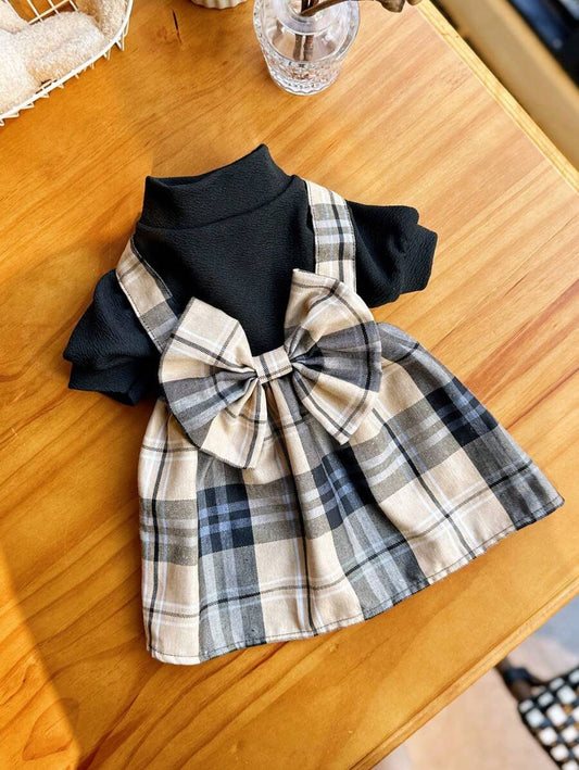 1pc Pet High Collar Puff Sleeve Oversized Bow-Tie Plaid Suspender Dress, Suitable For Cats And Dogs In Spring And Autumn