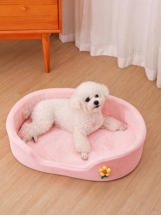 1pc Thick Soft Oval Pet Bed With Flower Decor, Comfortable Non-Slip Waterproof Oval Pet Bed Suitable For Medium/Small Cats & Dogs
