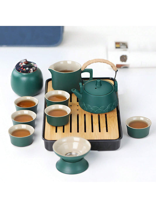 Tea Set With Bamboo Handle And Green Ceramic Teapot For Traditional Afternoon Tea