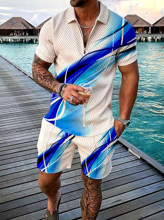 Men's Summer Fashion 3D Printed Short Sleeve Geometric Zip Lapel Shirt Set